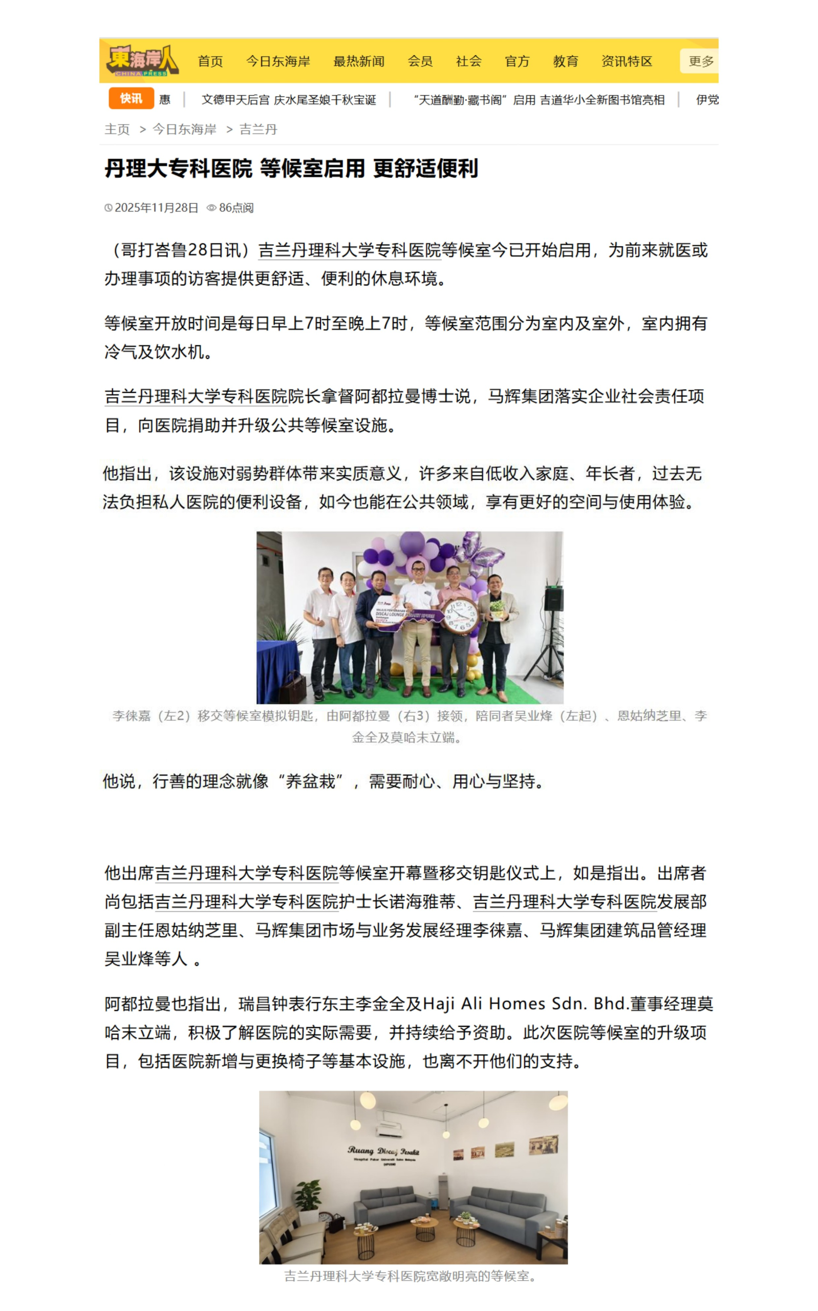 丹理大专科医院 等候室启用 更舒适便利